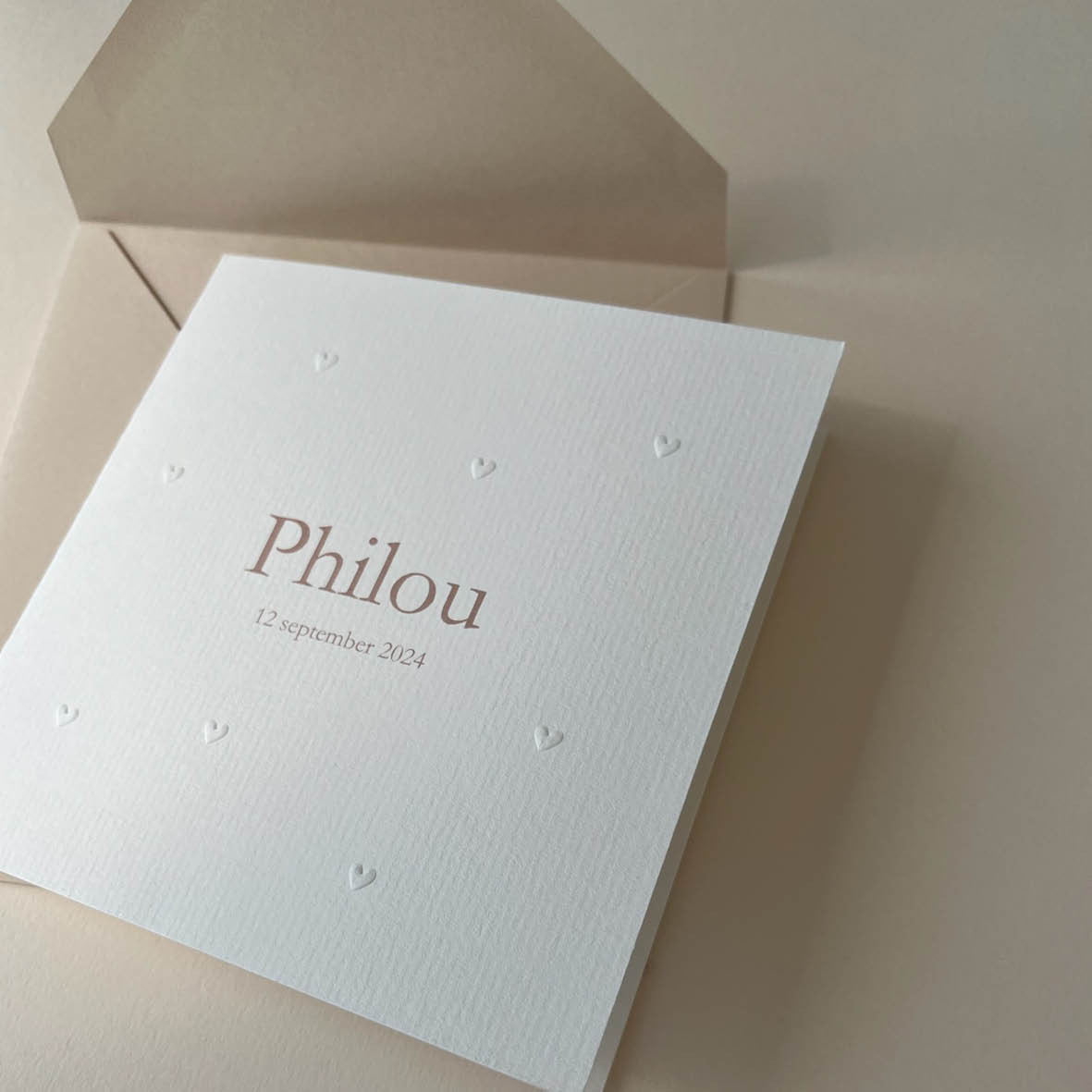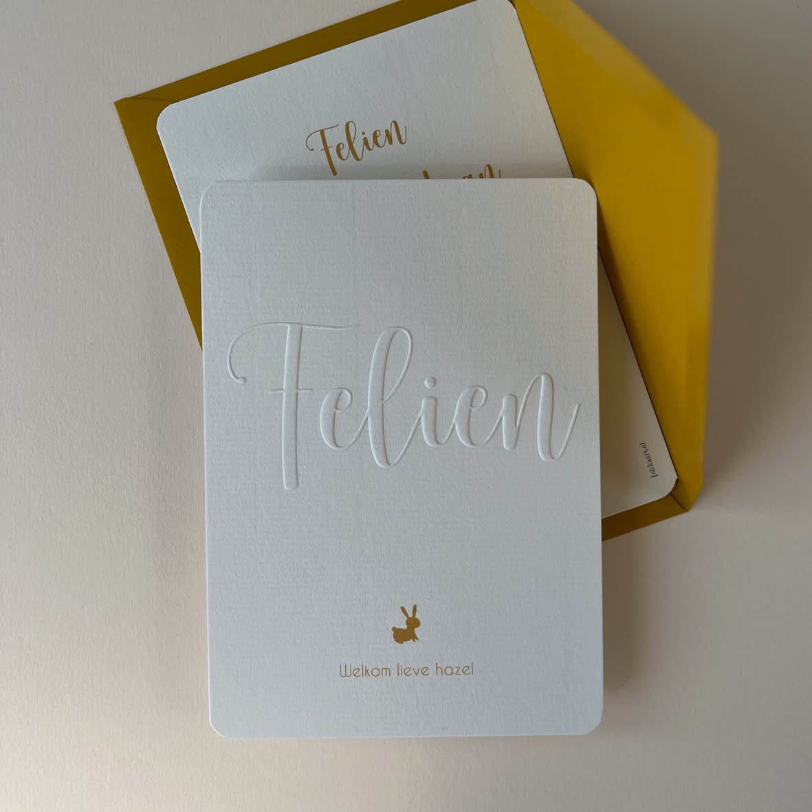 Geboortekaartjes met reliëfdruk (preeg) hebben een subtiele, tastbare uitstraling. Door delen van het ontwerp verhoogd in het papier te drukken ontstaat een elegant hoogteverschil, zonder inkt of kleur toe te voegen. Dit maakt reliëfdruk perfect voor minimalistische en tijdloze geboortekaartjes.
