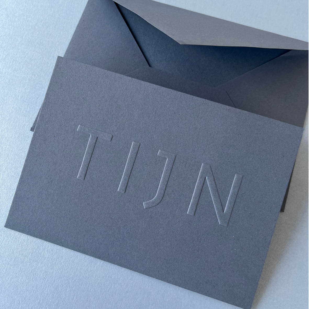 Laat je inspireren door kaartjes waarbij de naam, initialen of een klein symbool voelbaar naar voren komen.