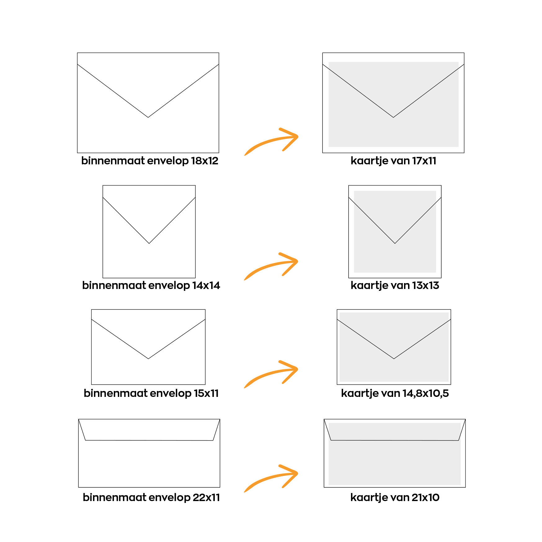 Er kunnen 4 verschillende maten enveloppen worden geleverd, die passen bij de door ons geselecteerde kaartjes.