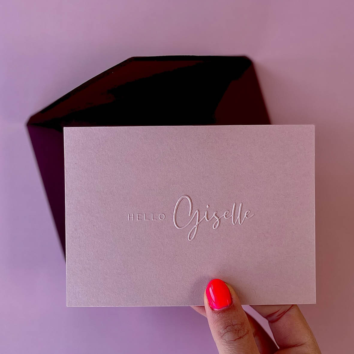 Laat je inspireren door kaartjes waarbij de naam, initialen of een klein symbool voelbaar naar voren komen.