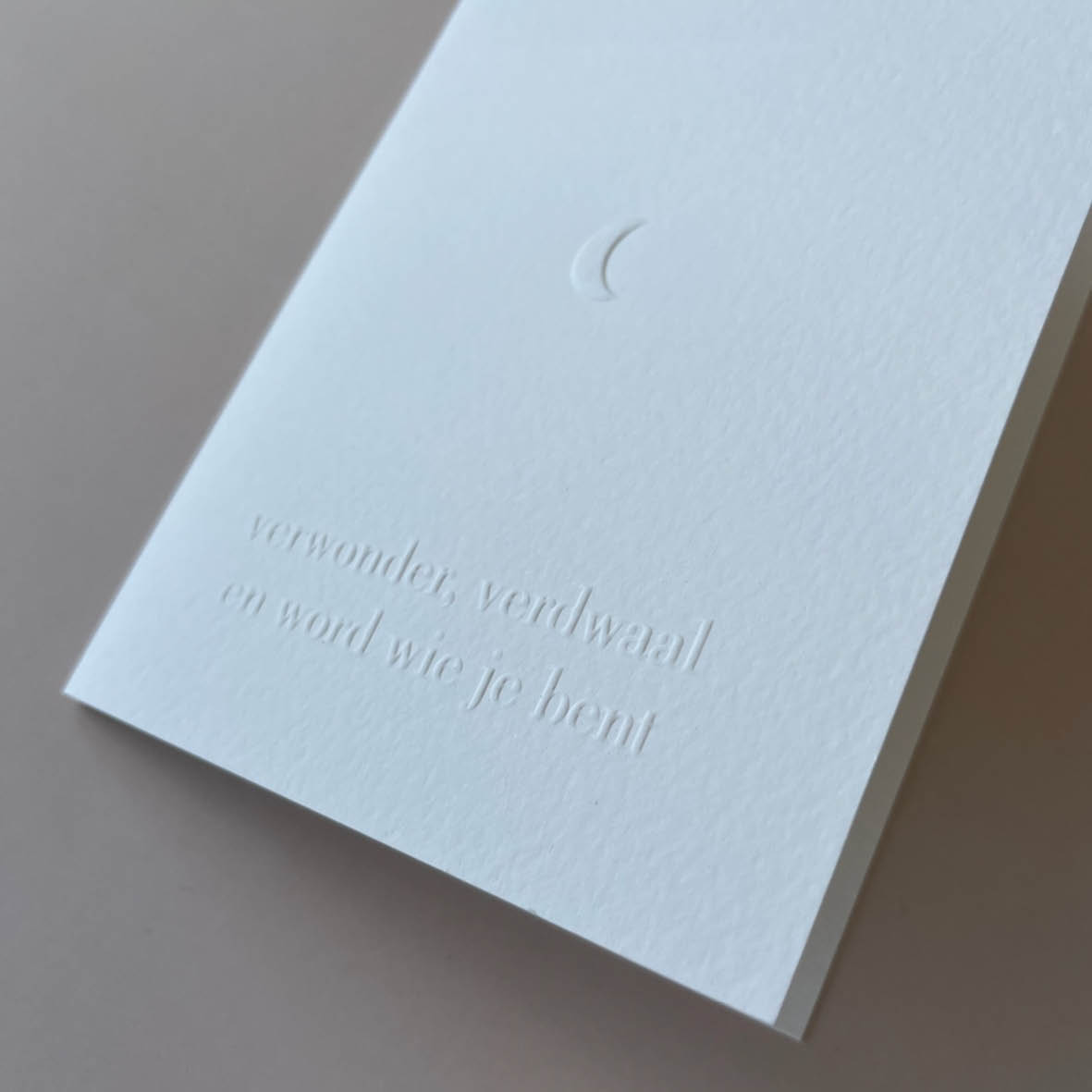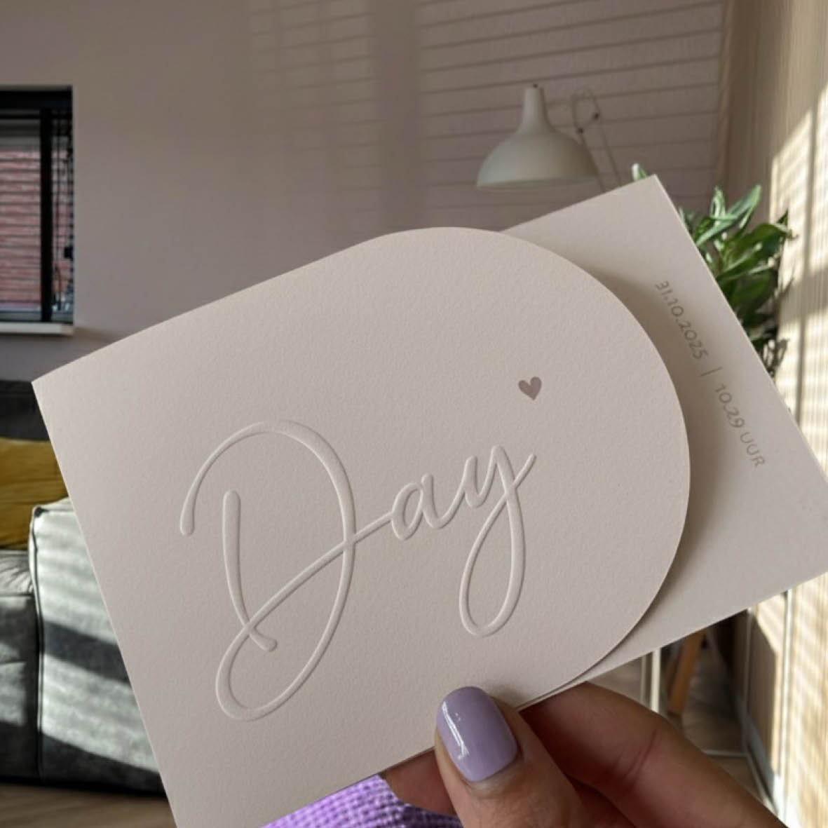 Geboortekaartjes met reliëfdruk (preeg) hebben een subtiele, tastbare uitstraling. Door delen van het ontwerp verhoogd in het papier te drukken ontstaat een elegant hoogteverschil, zonder inkt of kleur toe te voegen. Dit maakt reliëfdruk perfect voor minimalistische en tijdloze geboortekaartjes.