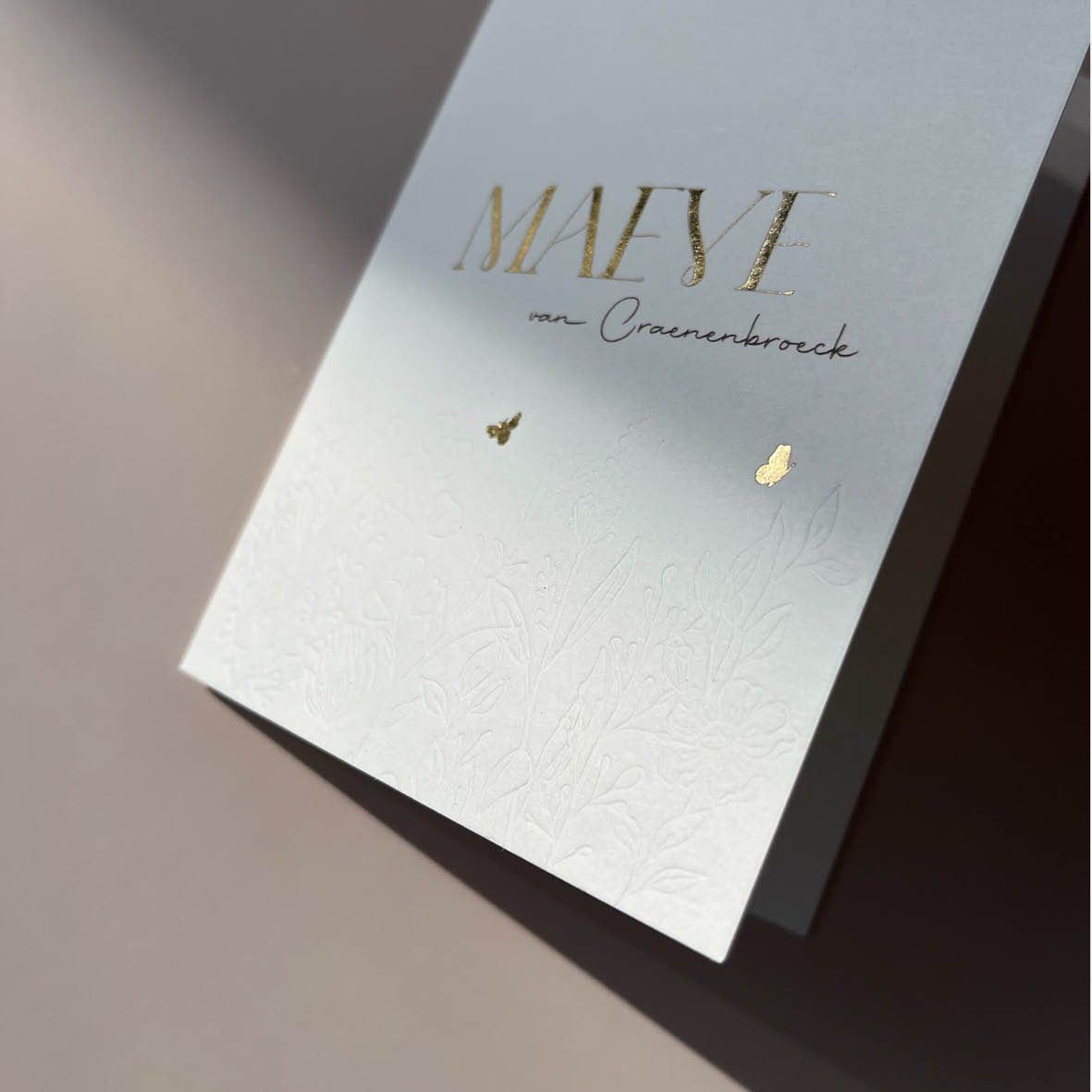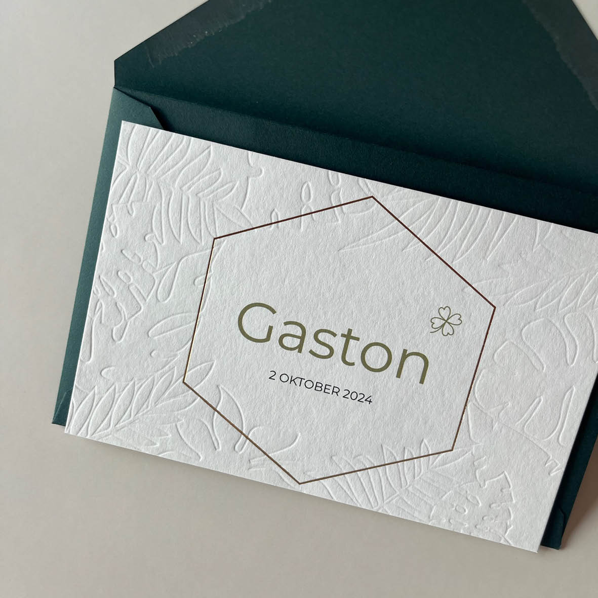Op zoek naar ideeën voor geboortekaartjes met reliëf verdiept, ook wel blinddruk genoemd? Deze druktechniek geeft een subtiel en stijlvol effect waarbij (delen van) het ontwerp verdiept in het papier wordt gedrukt, zonder inkt of kleur. Perfect voor rustige en tijdloze geboortekaartjes.