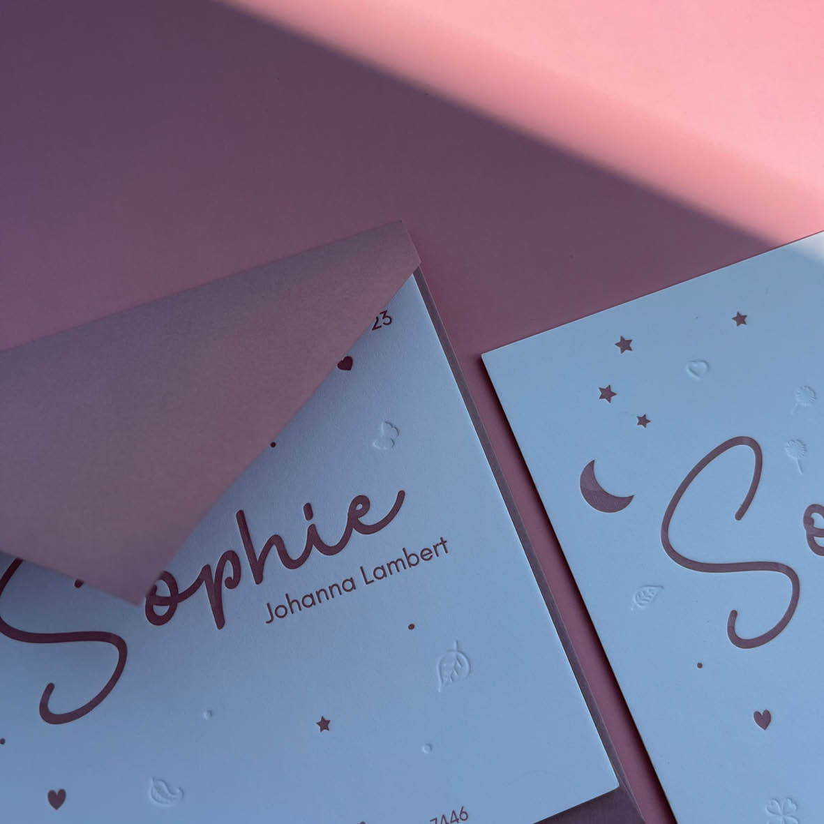 Op zoek naar inspiratie voor geboortekaartjes met letterpress? Letterpress is een ambachtelijke druktechniek waarbij de tekst en details voelbaar in het papier worden gedrukt waardoor een subtiel reliëf ontstaat. In combinatie met dik, zacht papier zorgt dit voor een karakteristiek kaartje. Letterpress is vooral geliefd bij minimalistische geboortekaartjes ontwerpen en klassieke.
