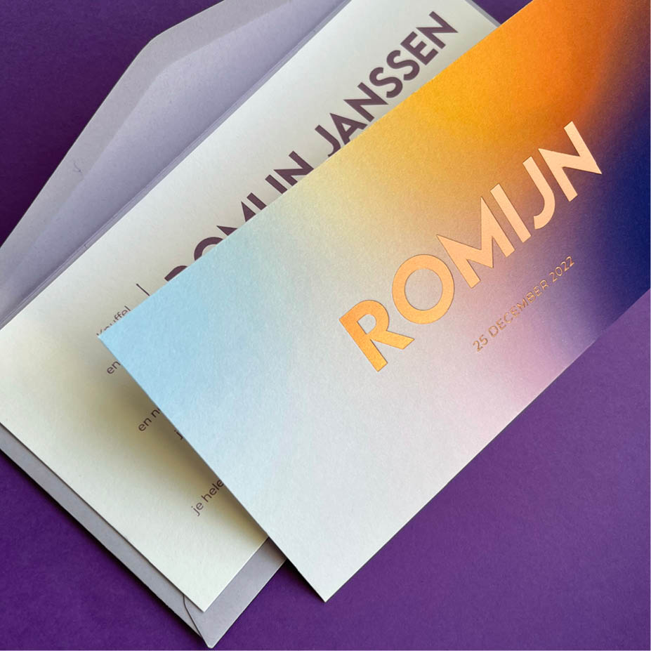 Een bijzondere druktechniek voor je geboortekaartje? We snappen natuurlijk wat je bedoeld! Maar wat precies? Er is zo onwijs veel om te kiezen en dat maakt het ook ontzettend lastig om te bepalen wat je wilt. En wat zijn nou die verschillen tussen al die soorten folie? Lees hier de volledige uitleg over onze druktechnieken begeleid met foto's. Let wel: Je bent geheel vrij om in de editor een andere bijzondere foliedrukkleur te kiezen, voor 3D folieprint te gaan (indien mogelijk) of de teksten zonder folie te maken. Kaartjes worden alleen met foliedruk, 3D folieprint en reliëfdruk gedrukt indien je in de winkelmand óók deze opties meebesteld. Anders worden ze standaard met een inktkleur voorzien.